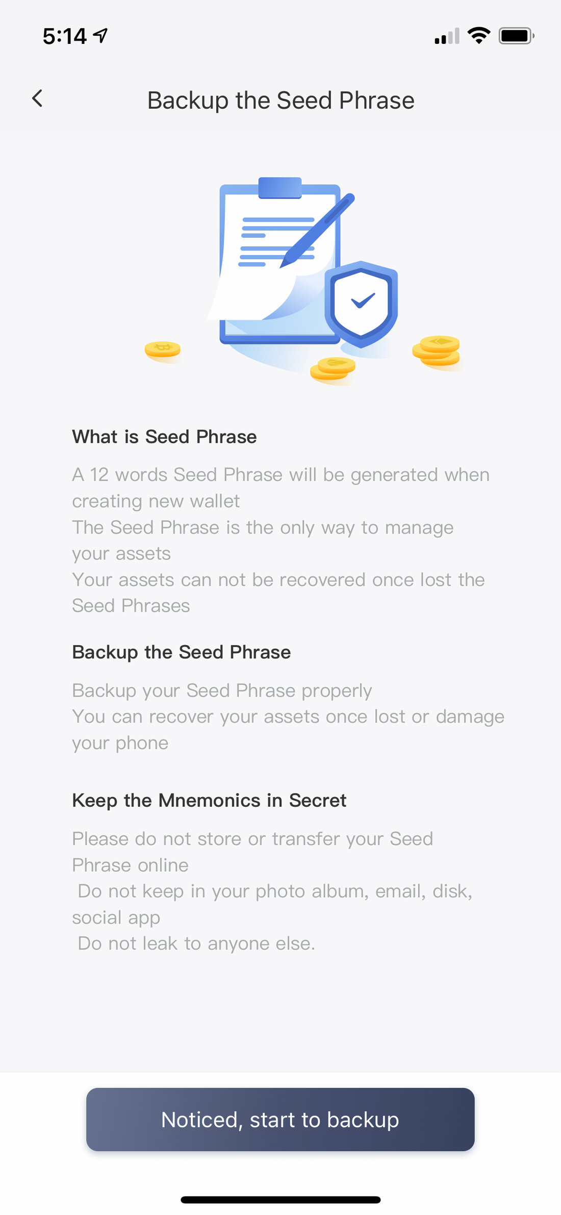 Click Noticed, start to backup to back up the seed phrase.