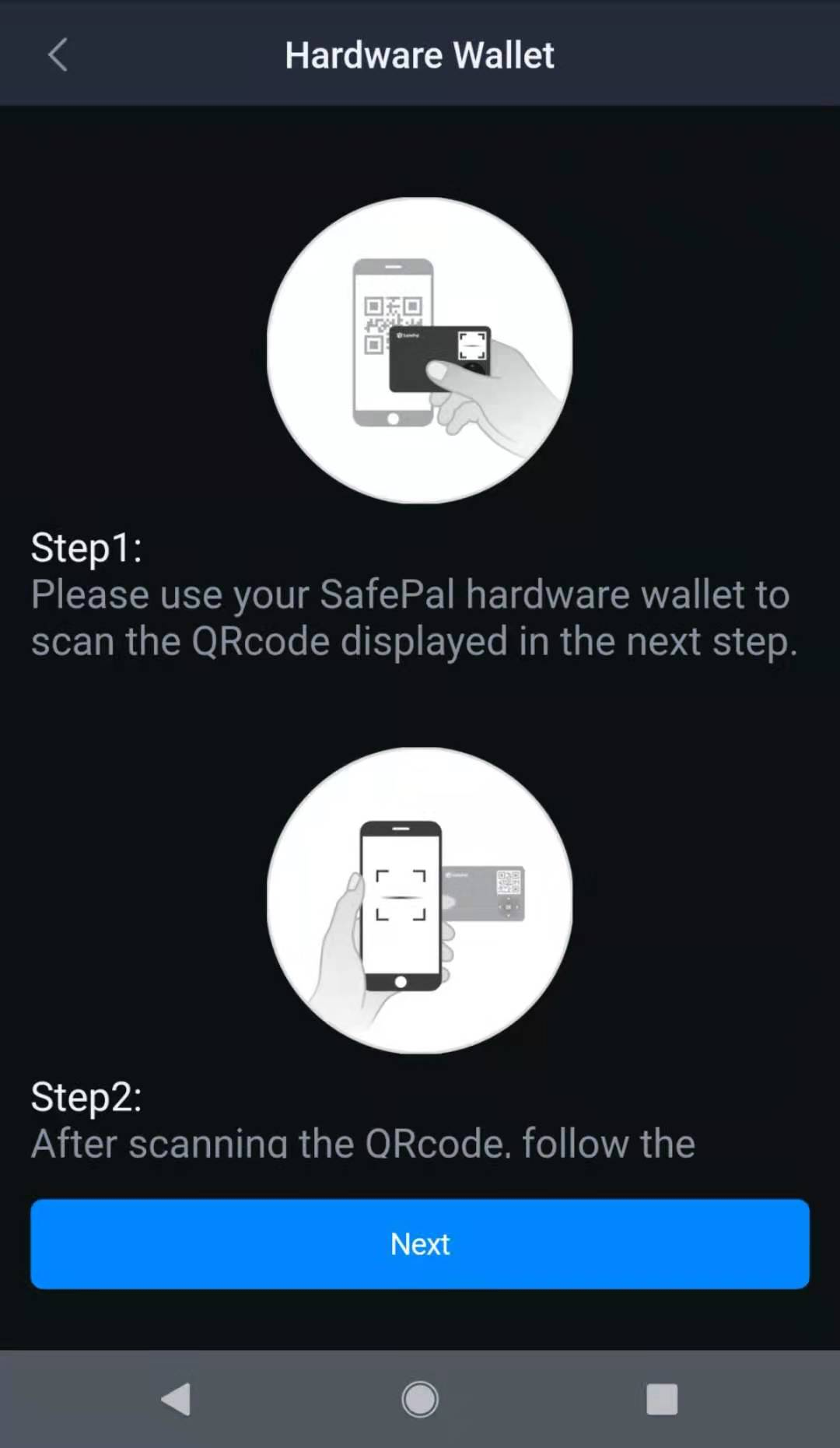 Use SafePal hardware wallet to scan the QRCode which will be displayed by tapping the Next button.