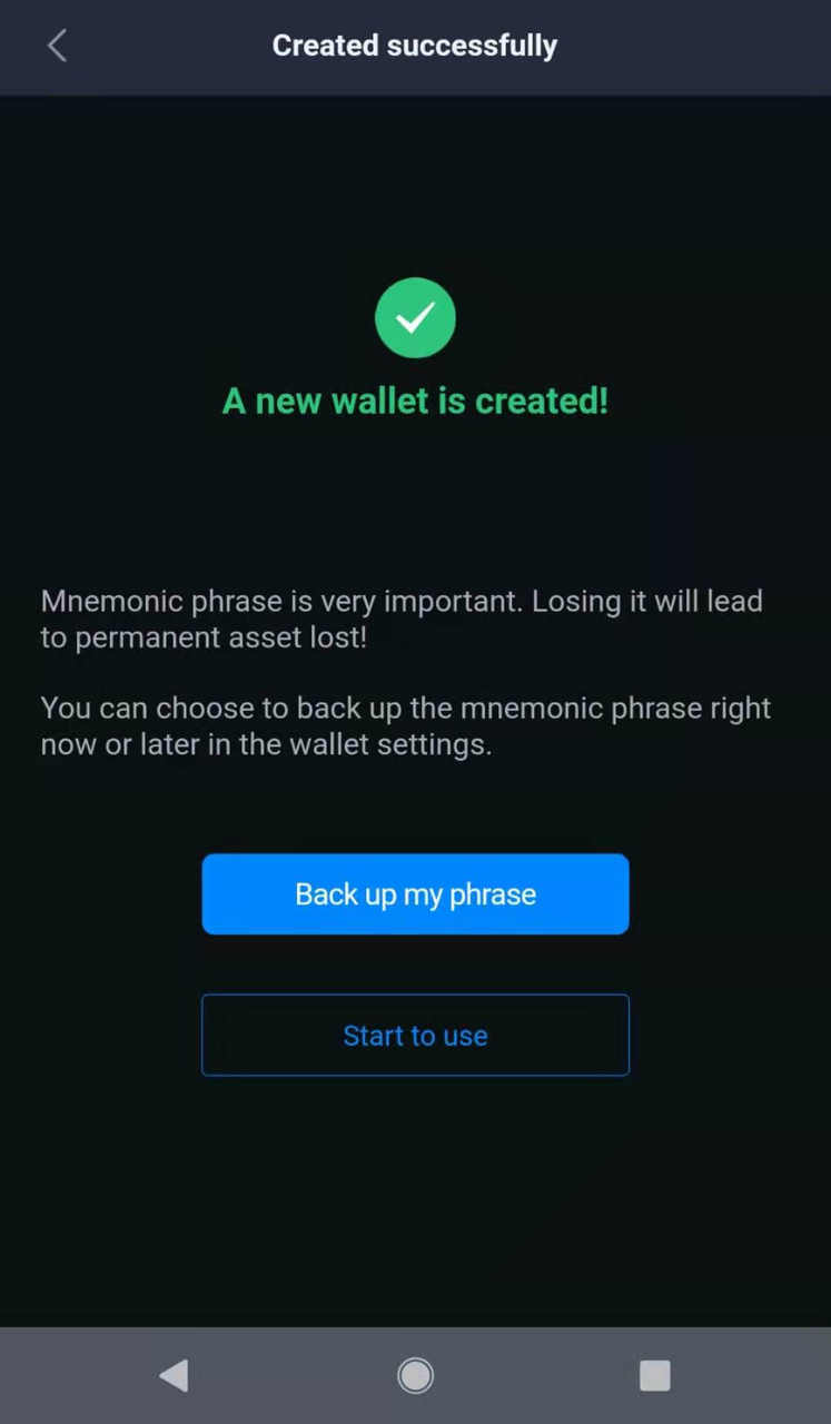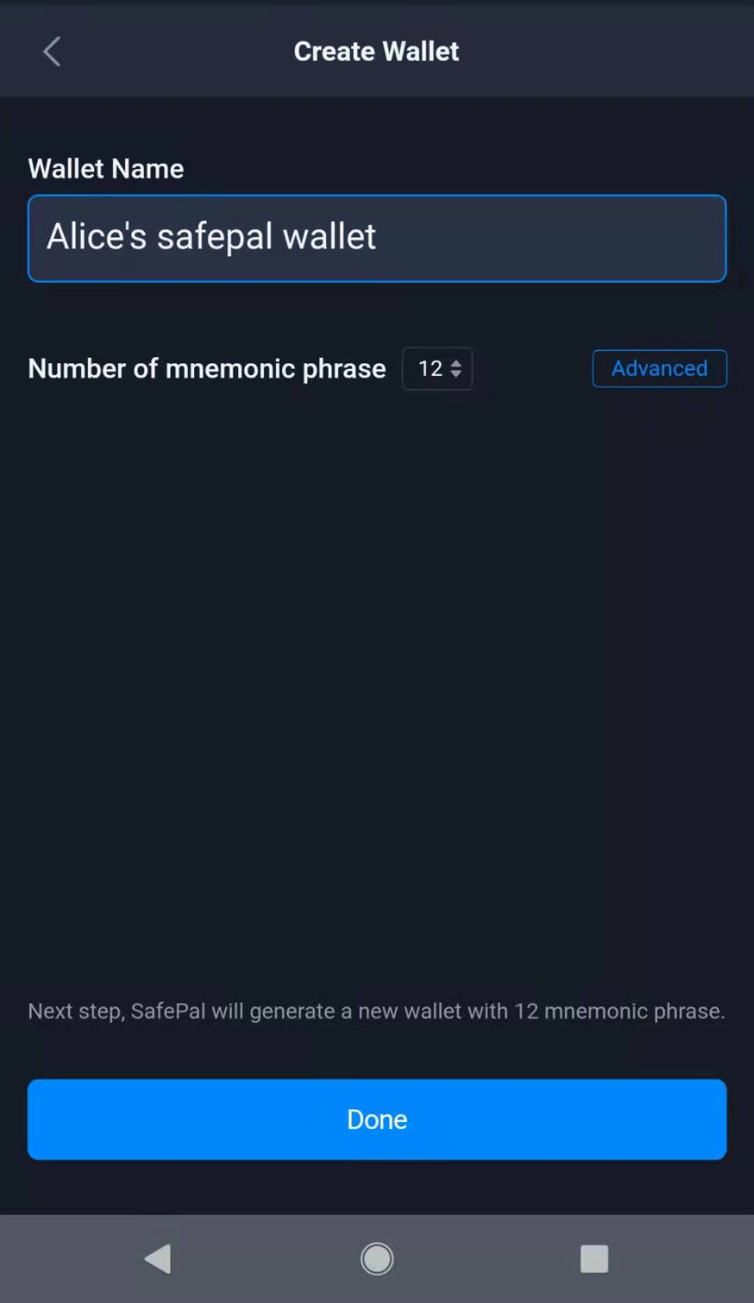 Tap Create Wallet to set the wallet's name and the mnemonic phrase that can be 12 or 24 mnemonic words.