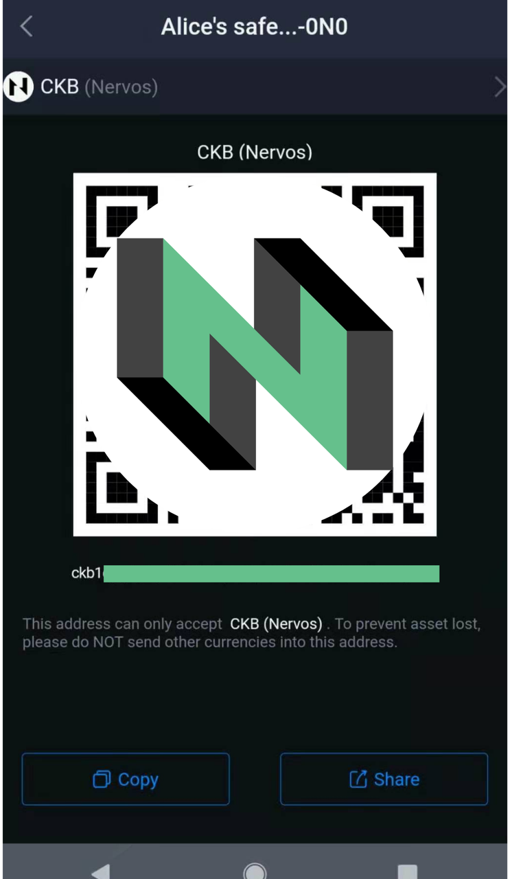 By text: Tap Copy to get the CKB address in the format of a series of letters and numbers, starting with "ckb".