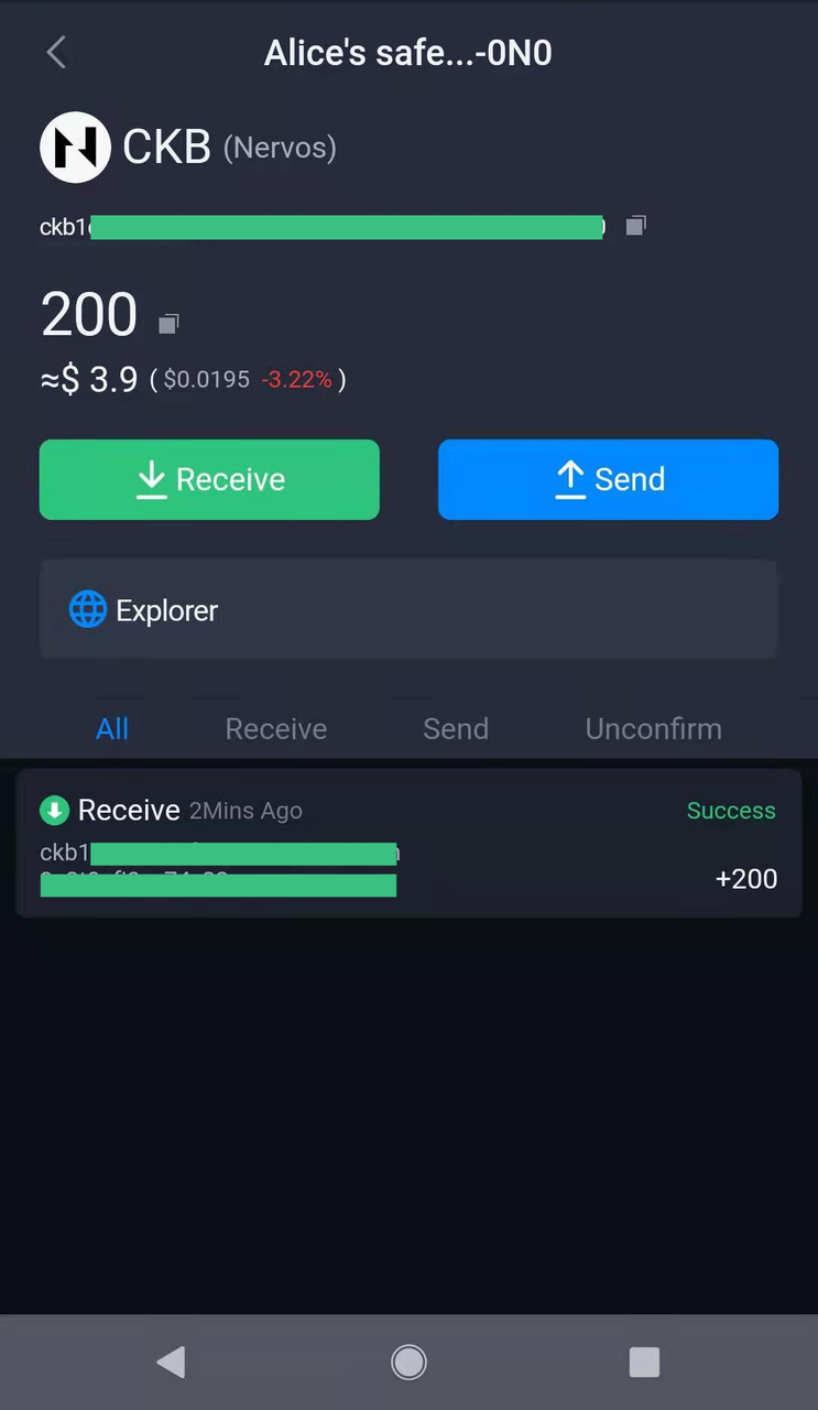 Share either form of the address information with the sender. Once the transaction is completed and verified, the related transaction information will appear in the CKB transaction history.