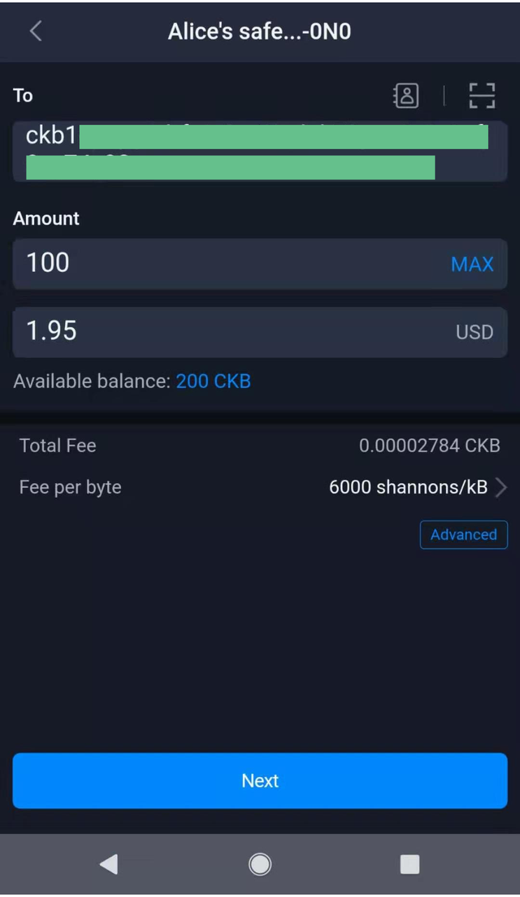 Tap Send, then fill in the address of the recipient and the desired transfer amount. Tap Next.